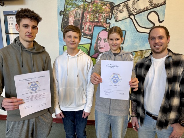 Ende Febuar findet die landesweite Runde der Mathematik-Olympiade statt. Vier Schülerinnen und Schüler des MCGs haben sich qualifiziert und treten beim Wettbewerb am Christianeum an. Wir gratulieren Julia-Sophie (5c), Lilli (6c), Jan (7b) und Albert (S4) und drücken die Daumen für die nächste Runde.